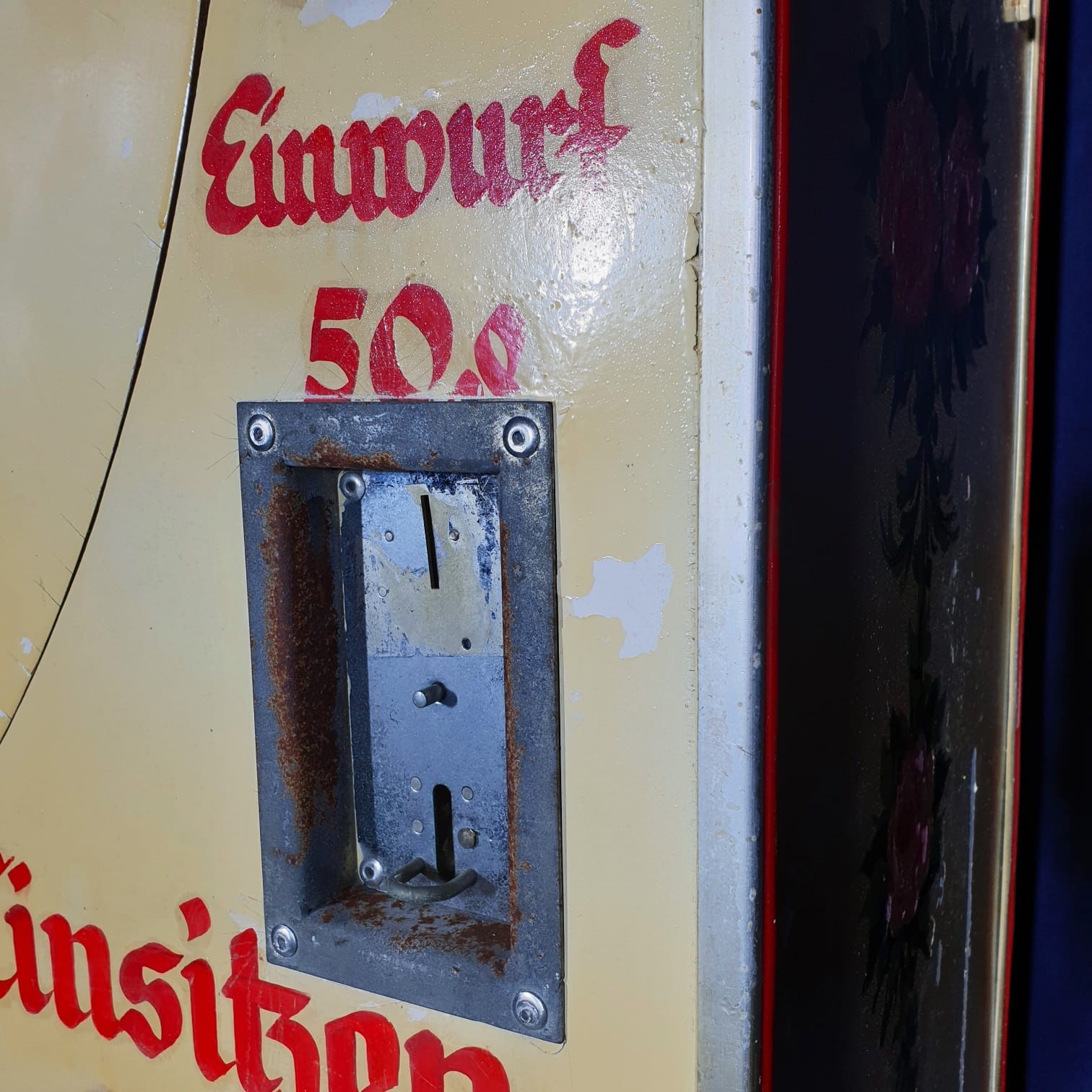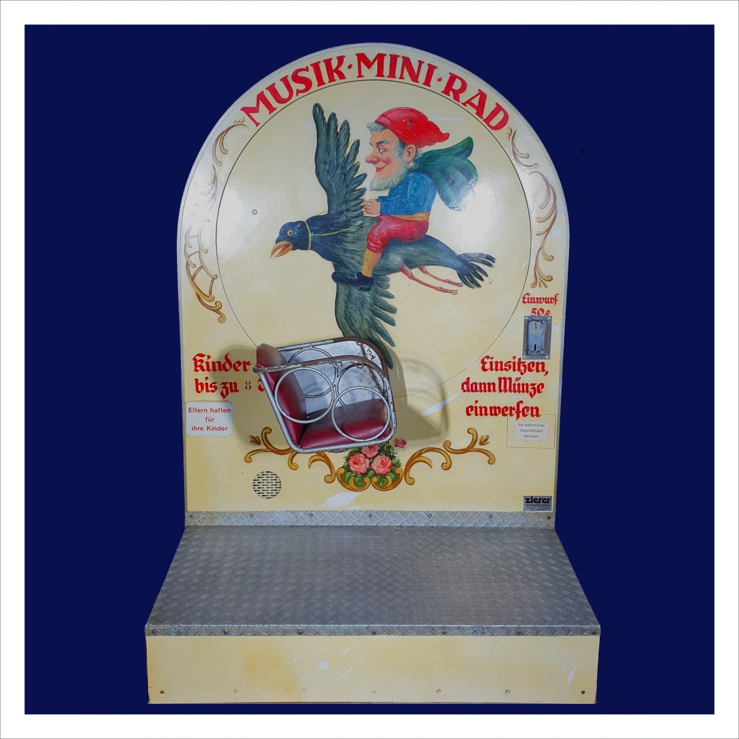 1975 hat die Firma Zierer dieses wunderschöne Musik-Mini-Rad hergestellt. Es kam vor Kaufhäusern und auf Jahrmärkten zum Einsatz. Alle Modelle wurden handbemalt. Im Inneren befindet sich ein Kassettenrekorder und sobald die 50 Pfennig eingeworfen werden, geht die musikalische Fahrt los.